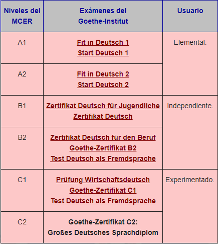 Los exámenes del Goethe-Institut disfrutan en todo el mundo de gran reconocimiento y los certificados que se obtienen con ellos, son valorados por empresarios e instituciones educativas superiores de numerosos países como prueba de cualificación. Los exámenes de alemán del Goethe-Institut corresponden a los niveles del Marco Común Europeo de Referencia para las lenguas (MCER), desde el nivel A1 para principiantes hasta el C2, el nivel de idioma más alto.